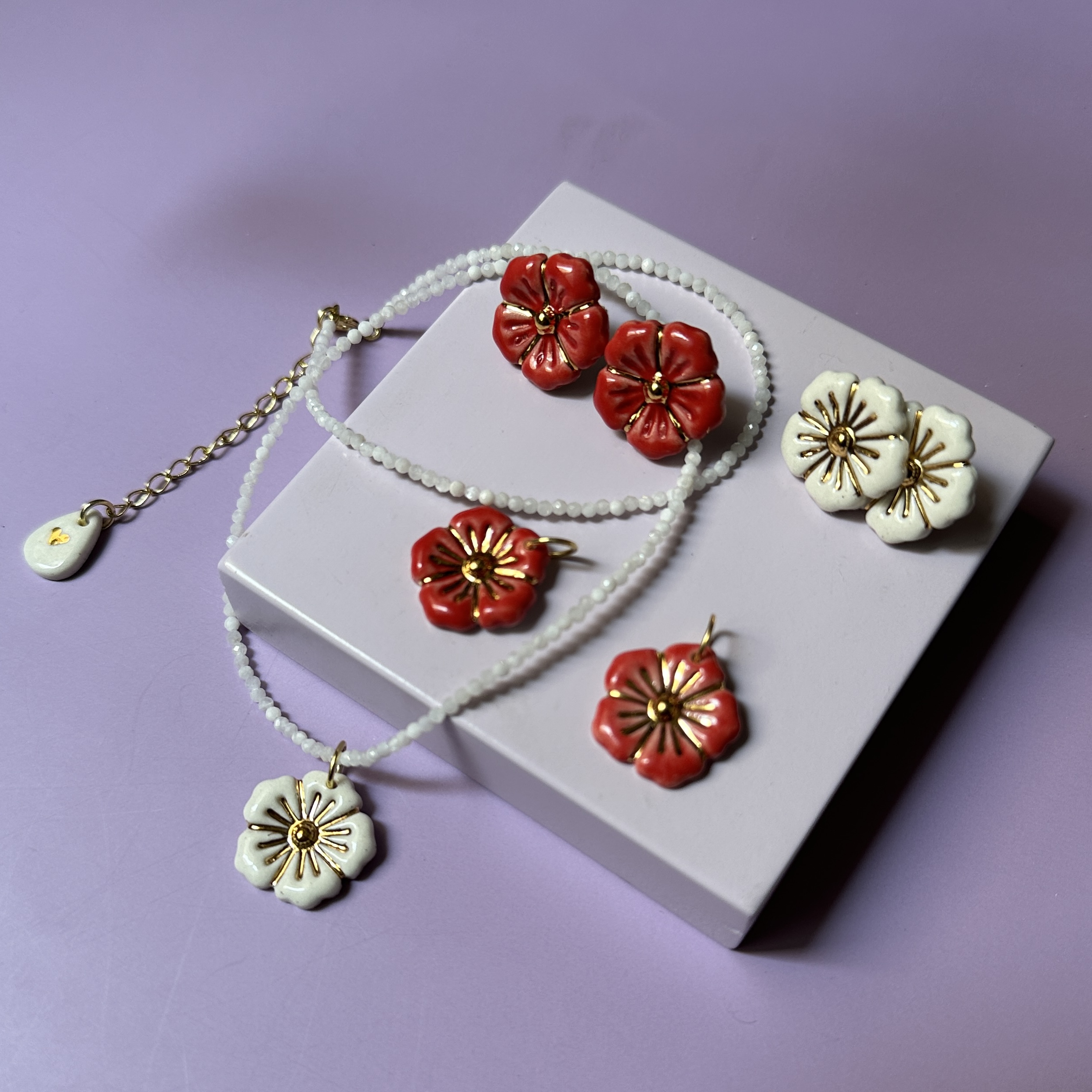 Pingente modelado na porcelana de alta temperatura, esmaltado um a um à mão. Possui desenho em baixo relevo pintado com ouro líquido.