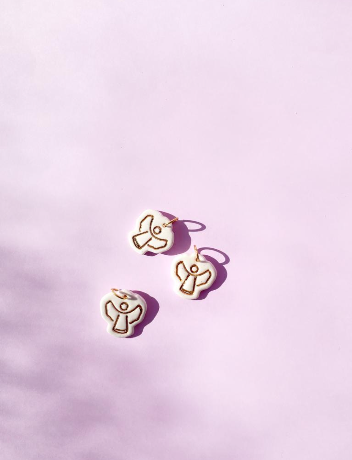 Pingente modelado na porcelana de alta temperatura, esmaltado um a um à mão. Possui desenho em baixo relevo pintado com ouro líquido.