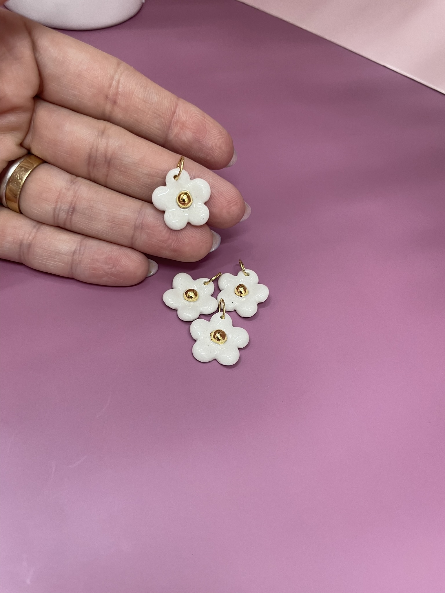 Pingente modelado na porcelana de alta temperatura, esmaltado um a um à mão. Possui desenho em alto relevo pintado com ouro líquido.